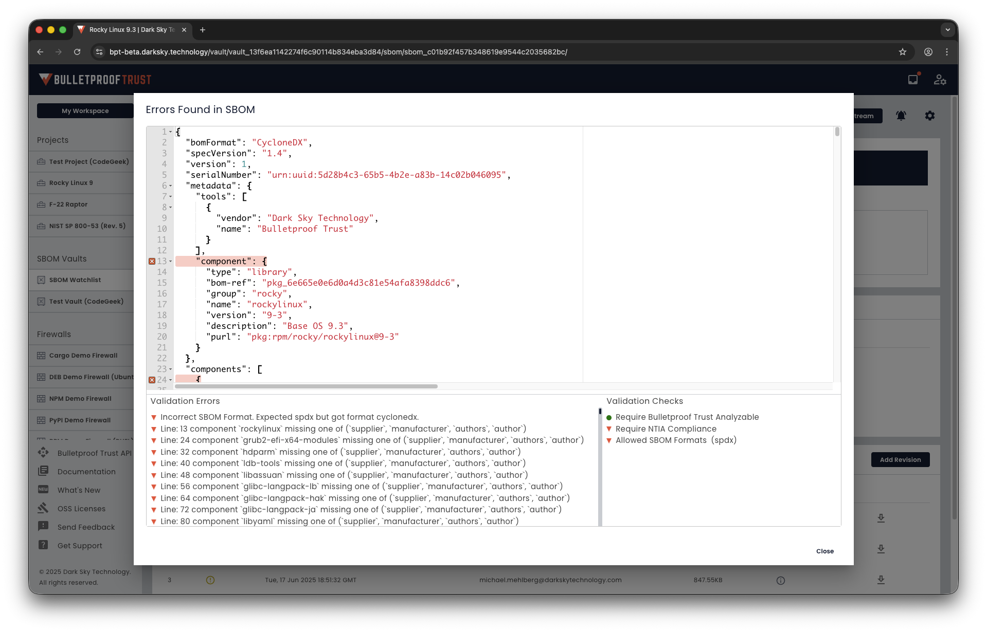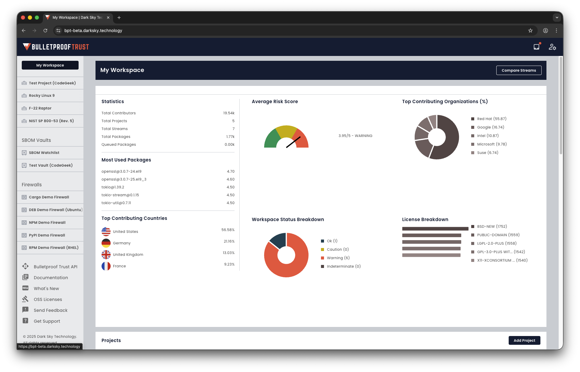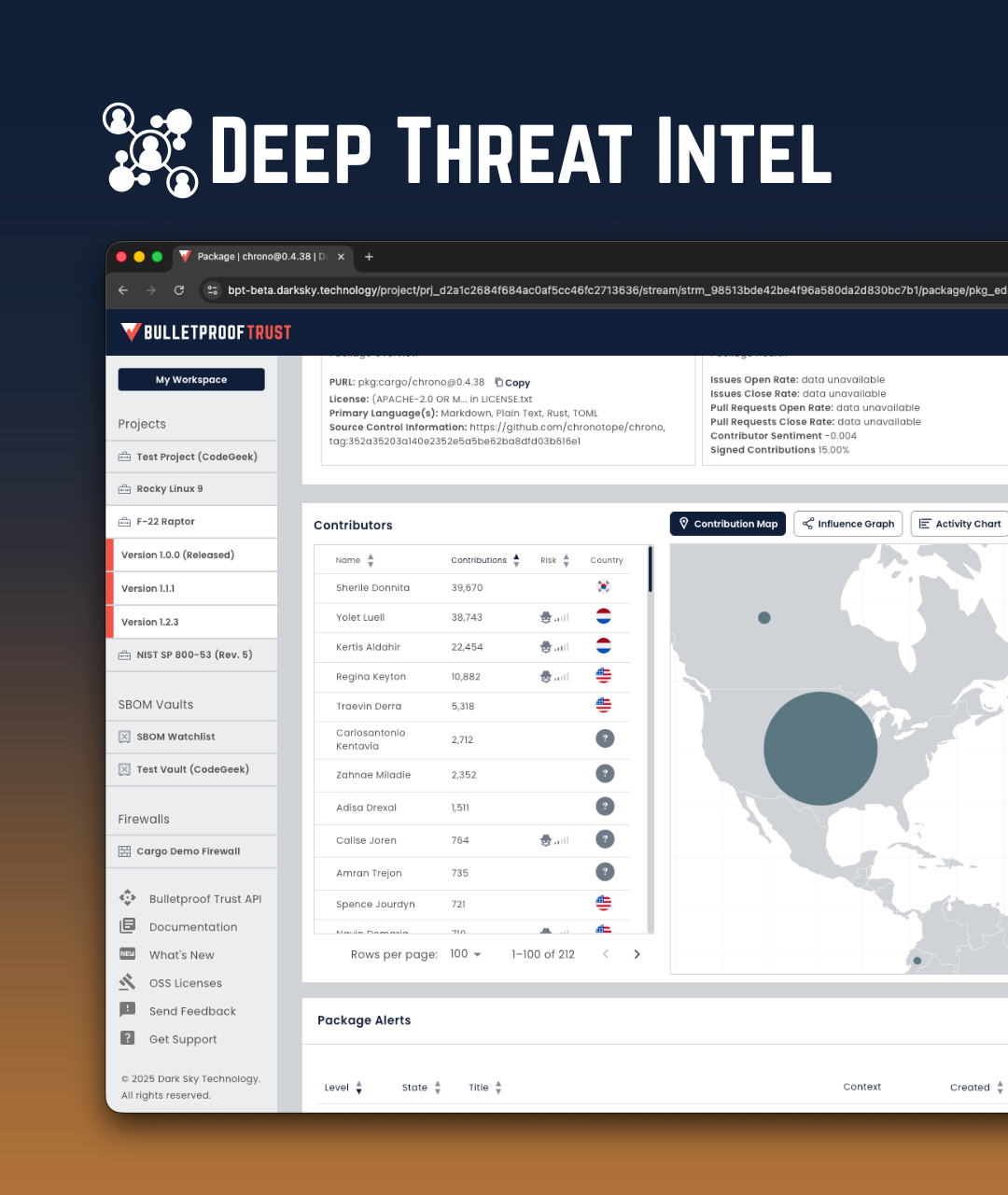 The Bulletproof Trust SBOM Vault securely manages your SBOMs across multiple suppliers and subcontractors, revisions, and programs. SBOM verification and validation ensures your SBOMs conform to industry standards and regulatory policies. SBOM components and dependencies are continuously analyzed, providing comprehensive risk alerts and threat insights.